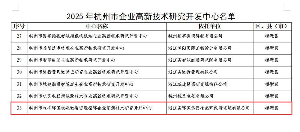 近日,由浙江省環(huán)保集團(tuán)生態(tài)環(huán)保研究院有限公司創(chuàng)建的“杭州市生態(tài)環(huán)保低碳數(shù)智資源循環(huán)企業(yè)高新技術(shù)研究開(kāi)發(fā)中心”,成功入選2025年杭州市企業(yè)高新技術(shù)研究開(kāi)發(fā)中心名單,標(biāo)志著生態(tài)環(huán)保研究院在科技創(chuàng)新領(lǐng)域取得重要突破,邁入新的發(fā)展階段。