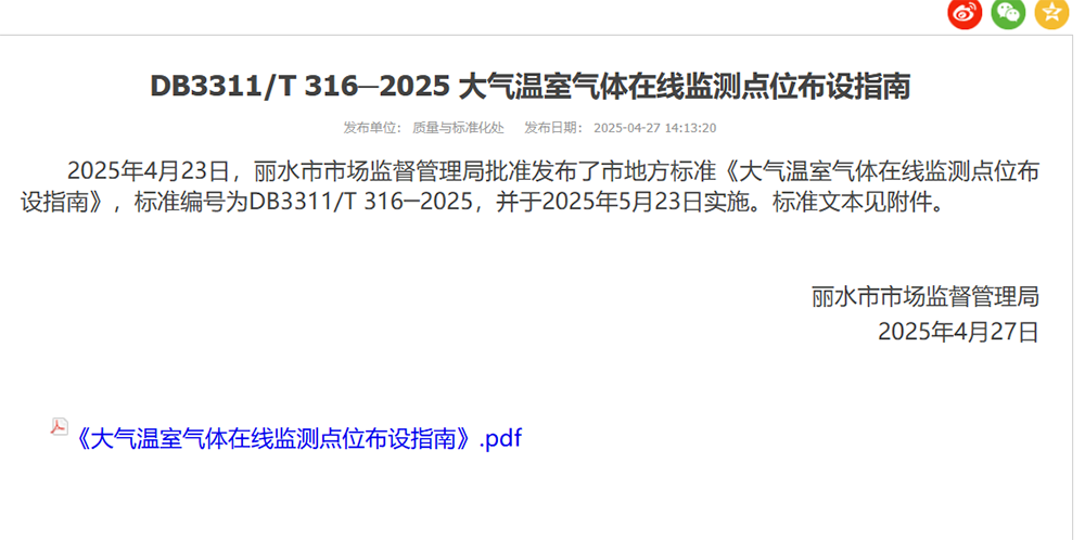 省環保集團牽頭起草的麗水市地方標準《大氣溫室氣體在線監測點位布設指南》正式實施
