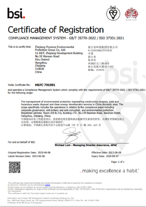 喜訊!浙江省環(huán)保集團成為國內(nèi)首個通過ISO 37301合規(guī)管理體系認(rèn)證的環(huán)保集團